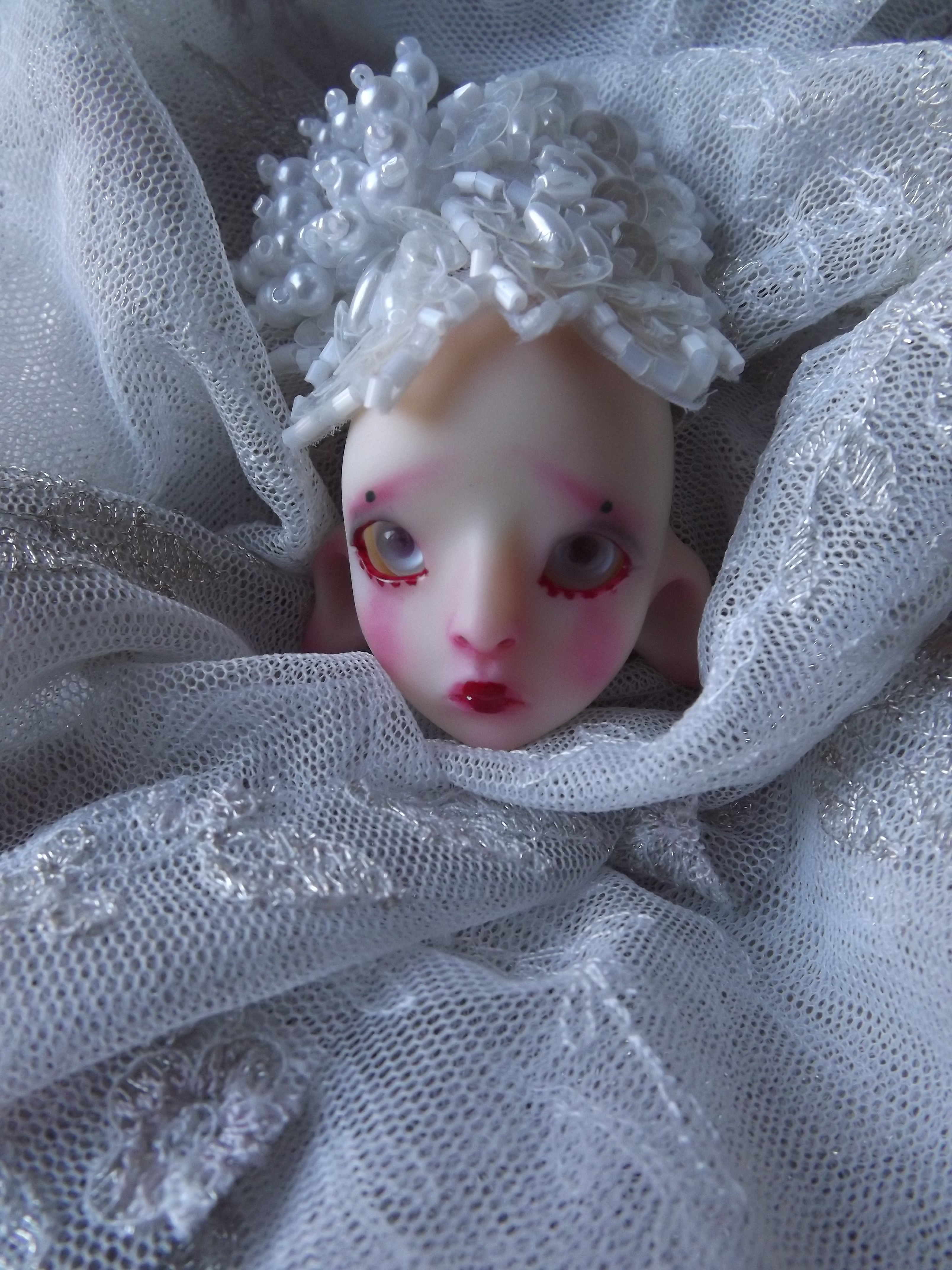 My japanese msd in progress doll was alive, still in blank paperclay but moving and breathing as a human being would. She was following the last breath of someone who drowned in a fresh river. From this river, till the ocean, to never lose that person, she ran after the echo of this last breath. I was running behind her. It was a silver night, so many shiny stars and the moon as a glowing giant snow ball; and many colorful flowers on our path. The grass too was like glowing as green fireworks. Then, on the beach, under the silver light, she stopped to run, and smiled shyly. I asked ” Did you catch it? That last breath?”