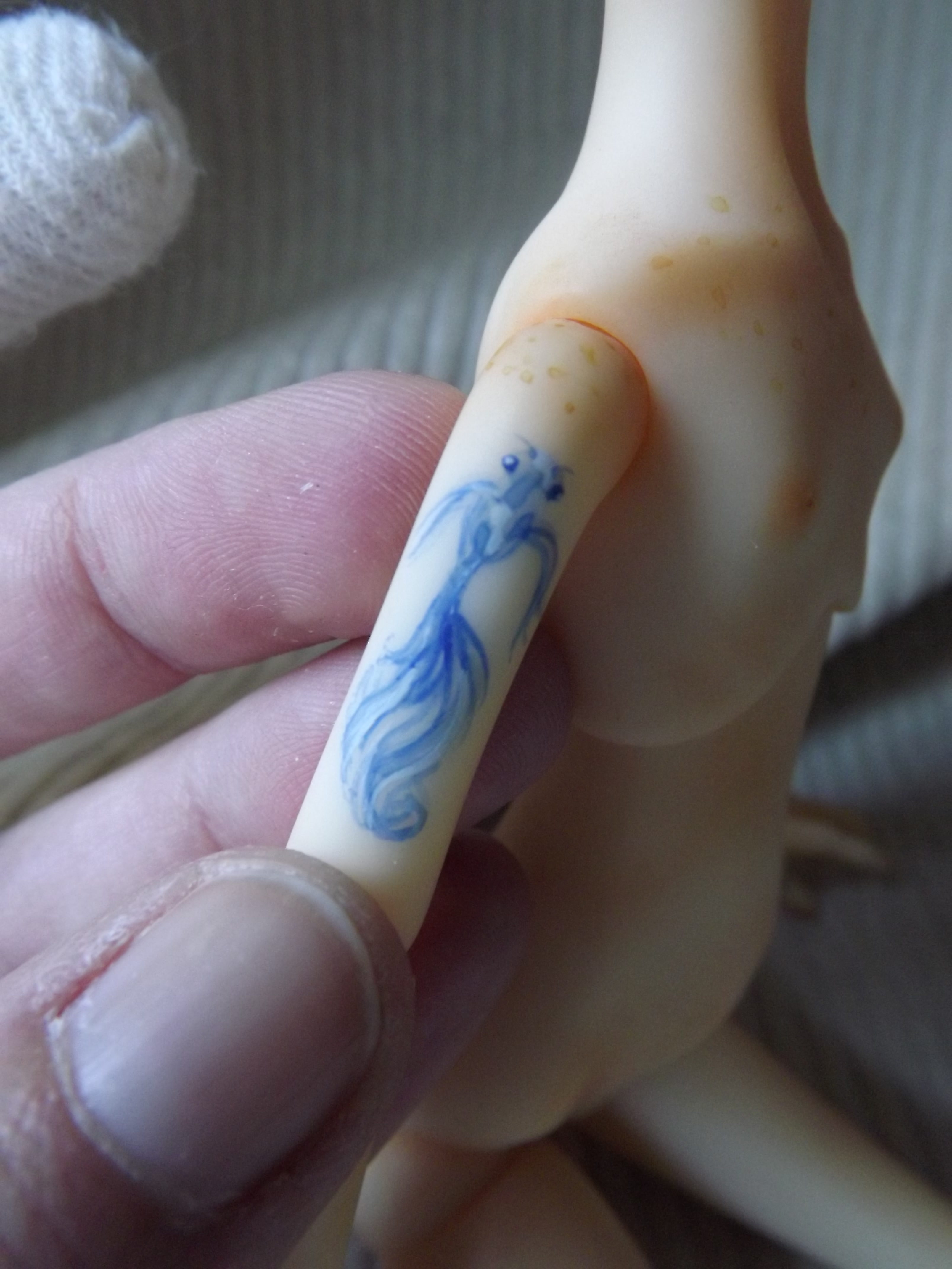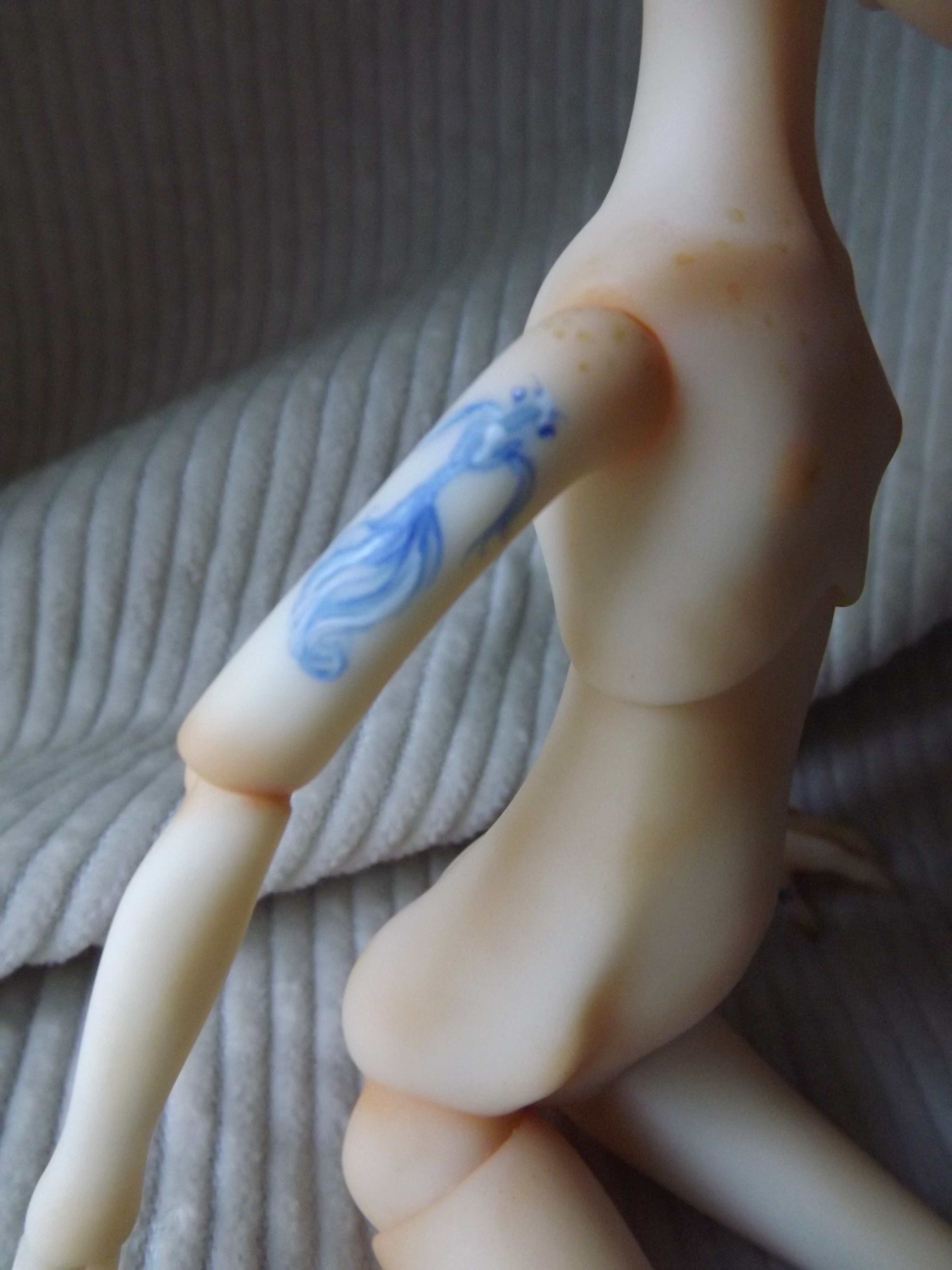 And… a tanned fisherman elf. That very one has tattoos, a fish of course for she is living on the beach, fishing on the sun. The second is… a secret. This doll is the representation of someone I profoundly ADORE and is a gift for another dearest friend of mine… I can’t say more for it is a surprise!