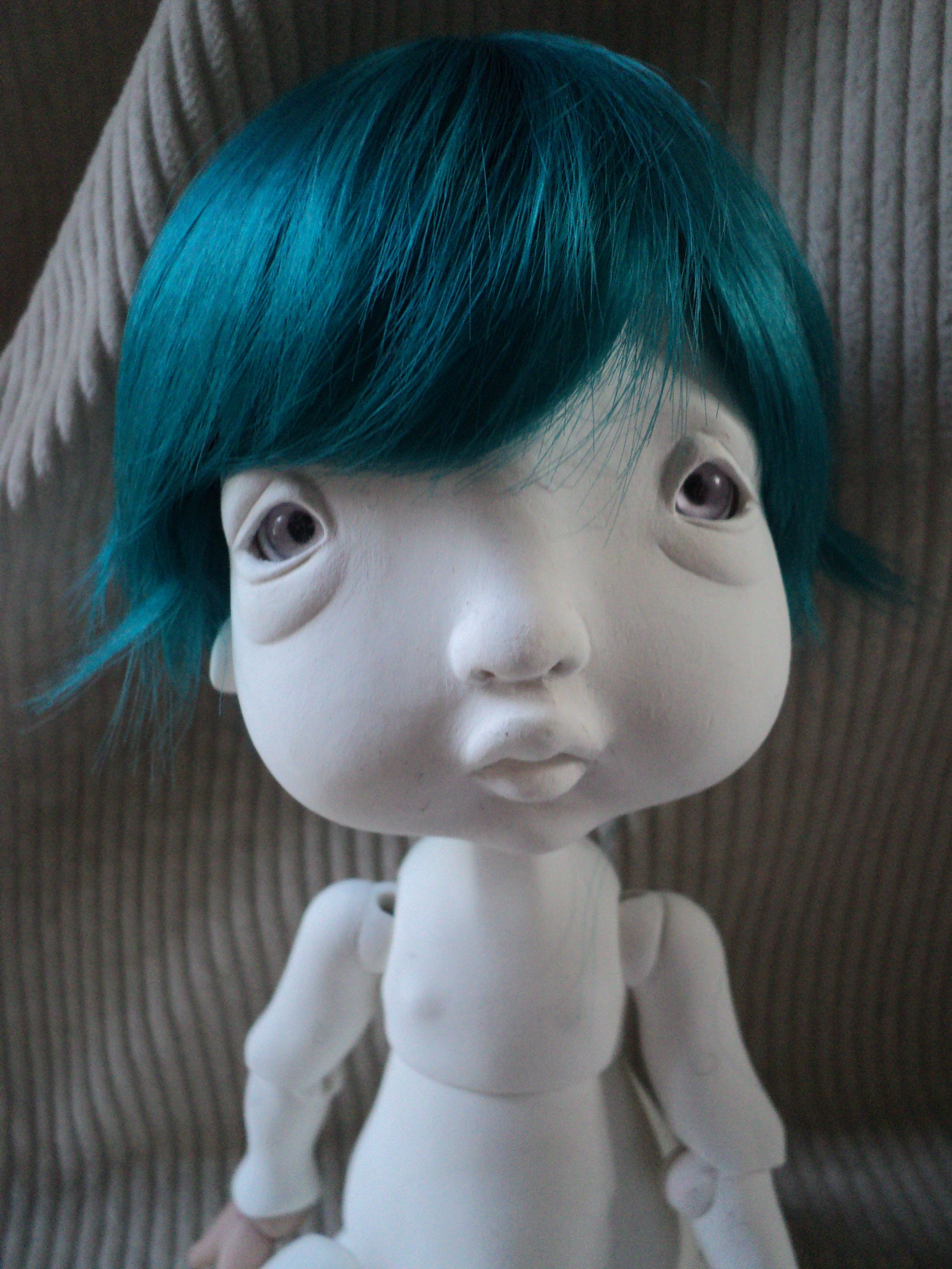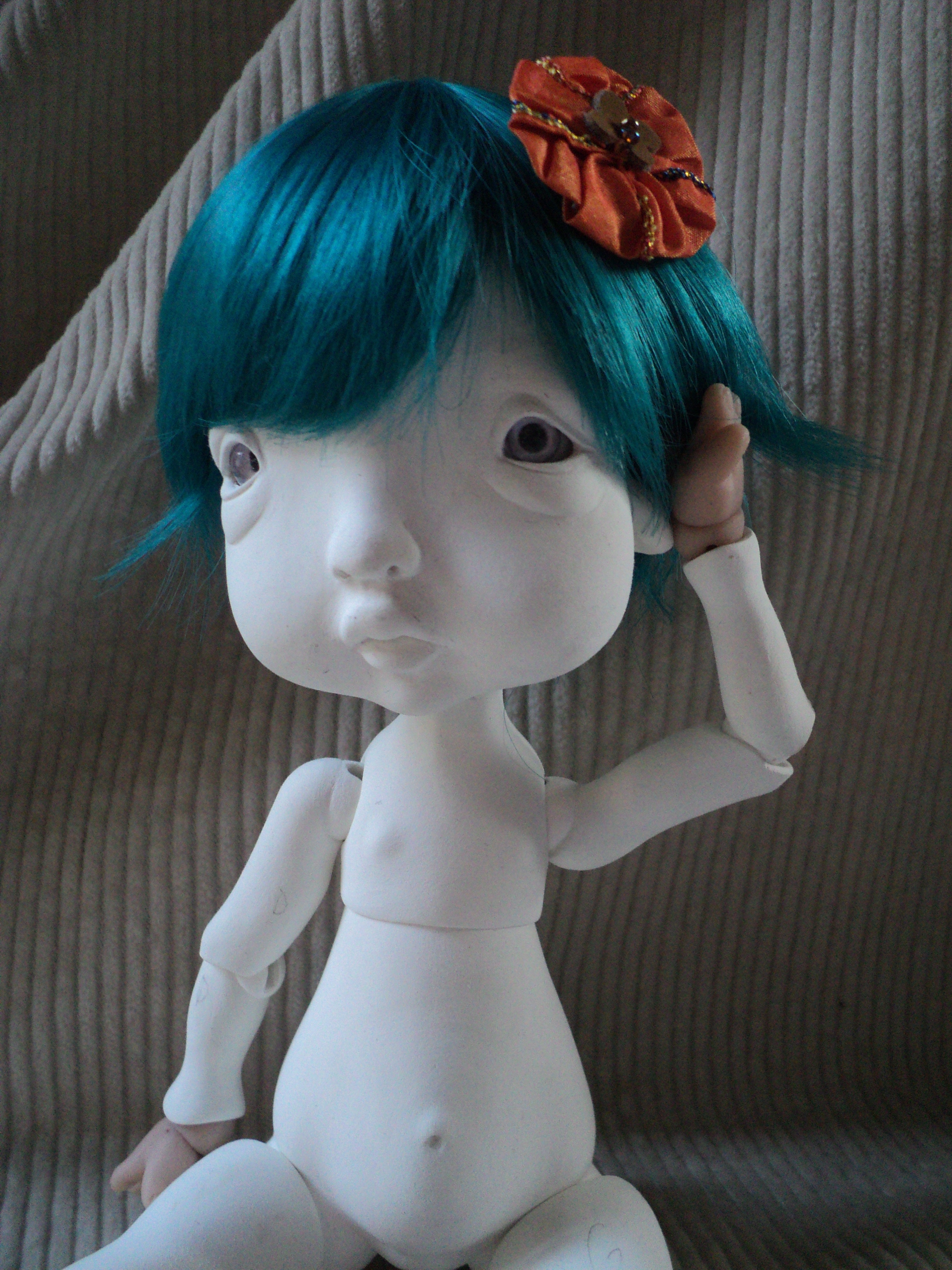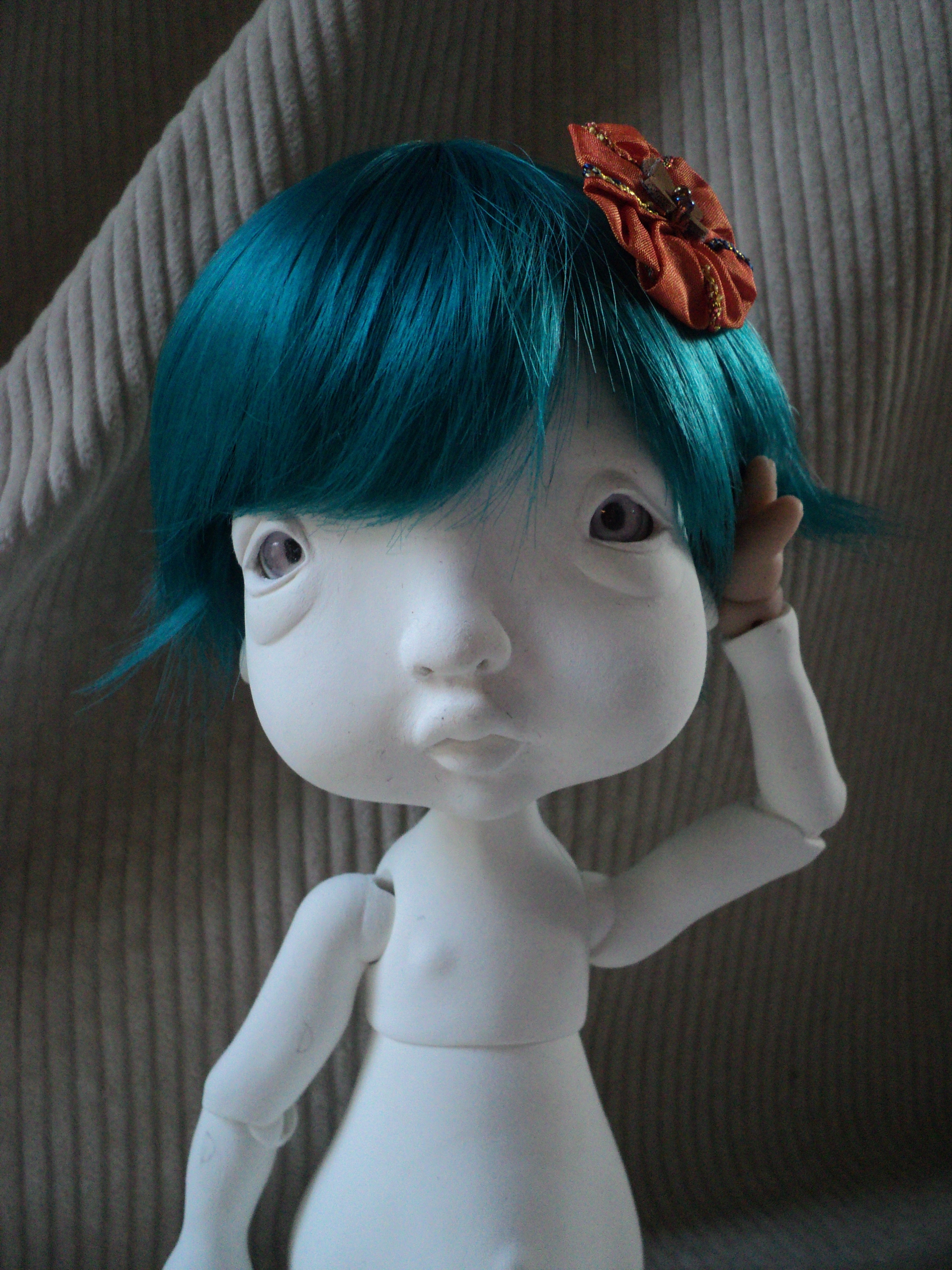 Now, the photos! With light pink eyes, a new green blueish wig and a hand knitted little hat made by my mother. I confirm that her eyes size is 12mm, and her wig size is 7/8.