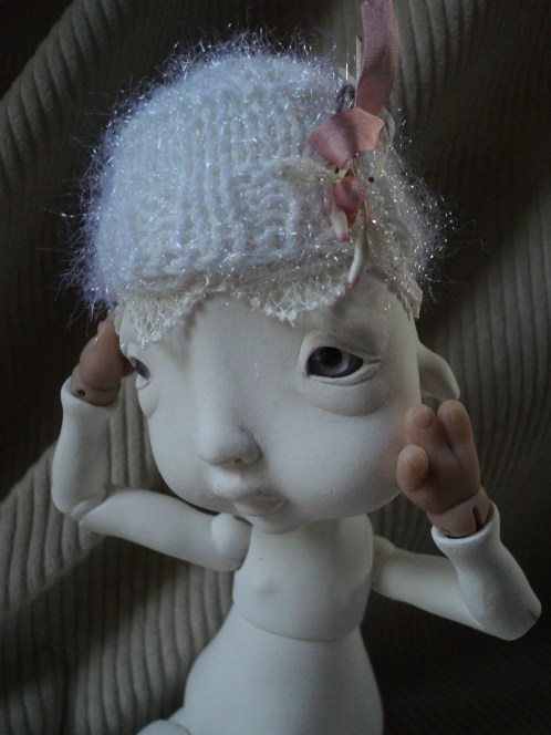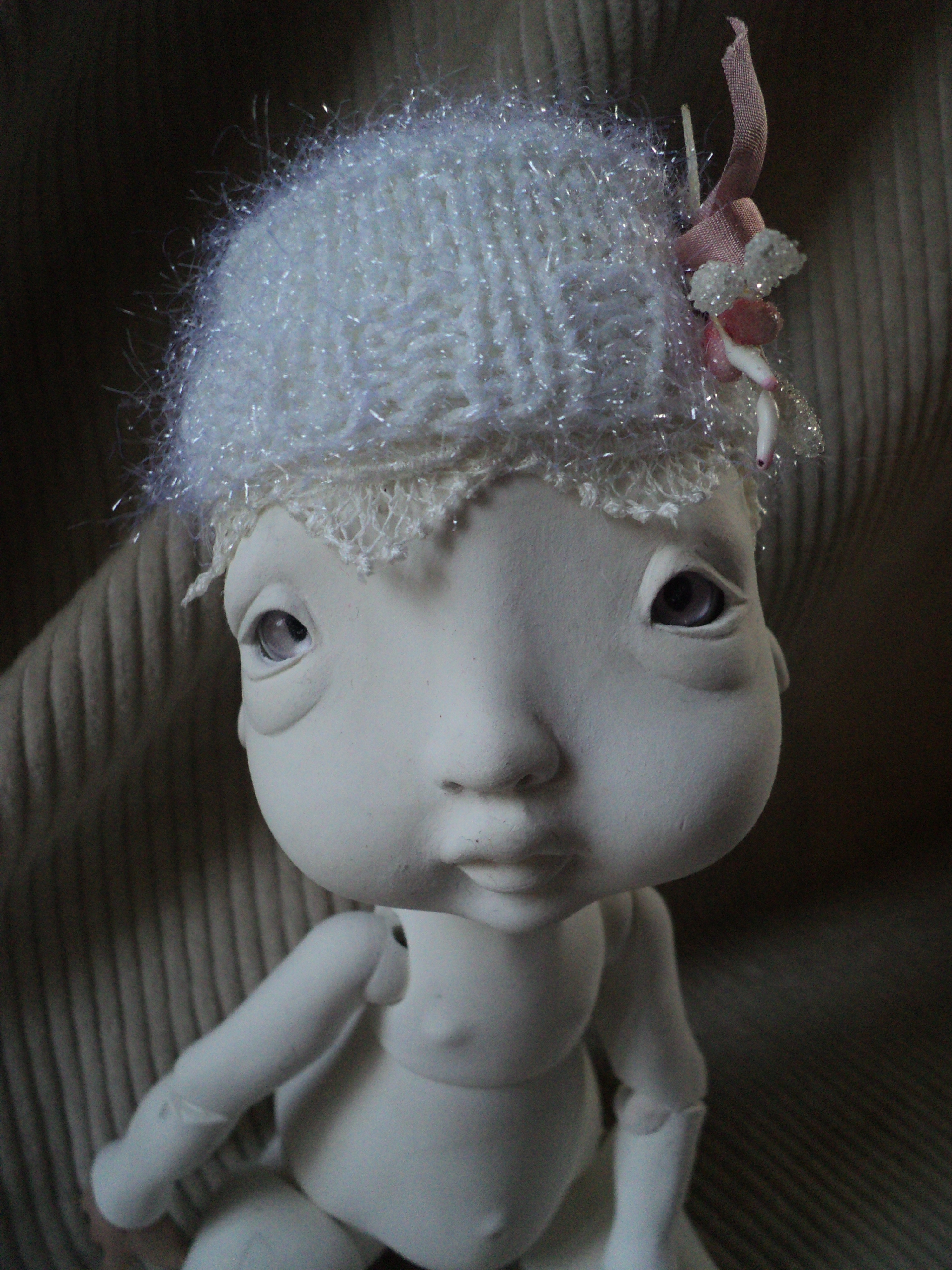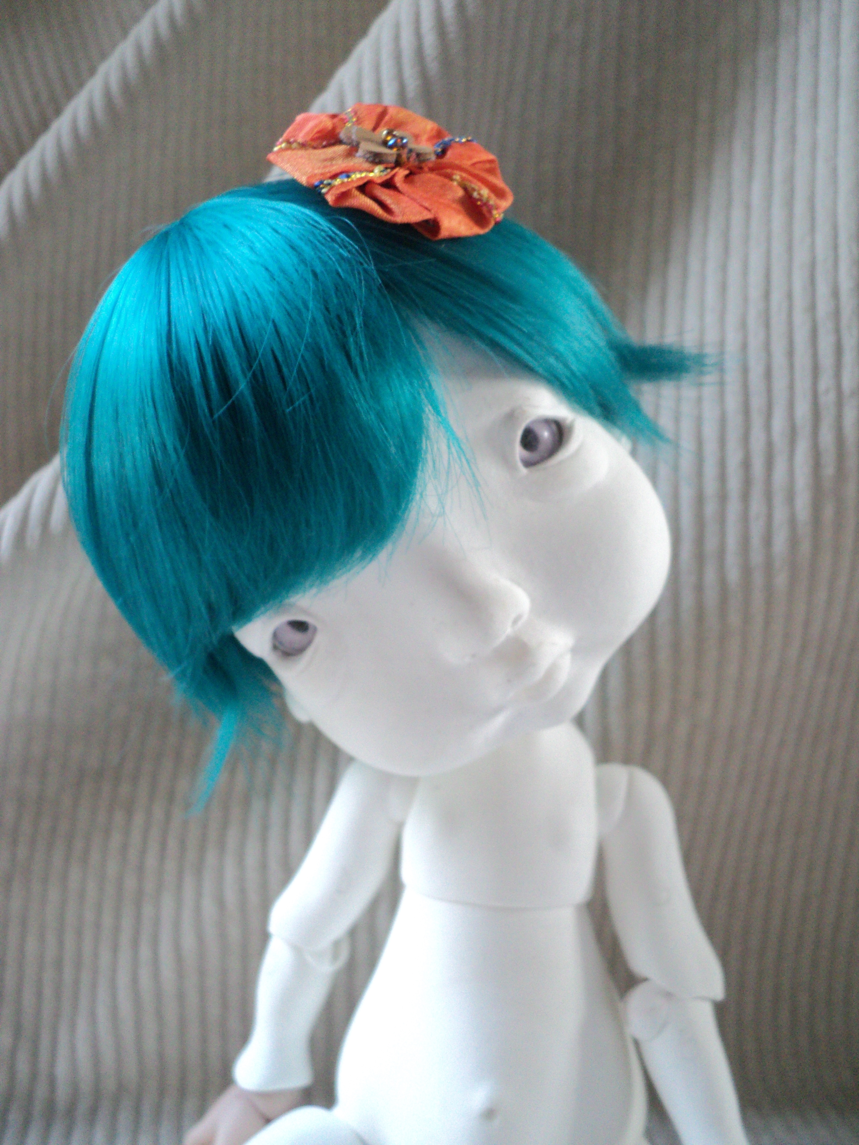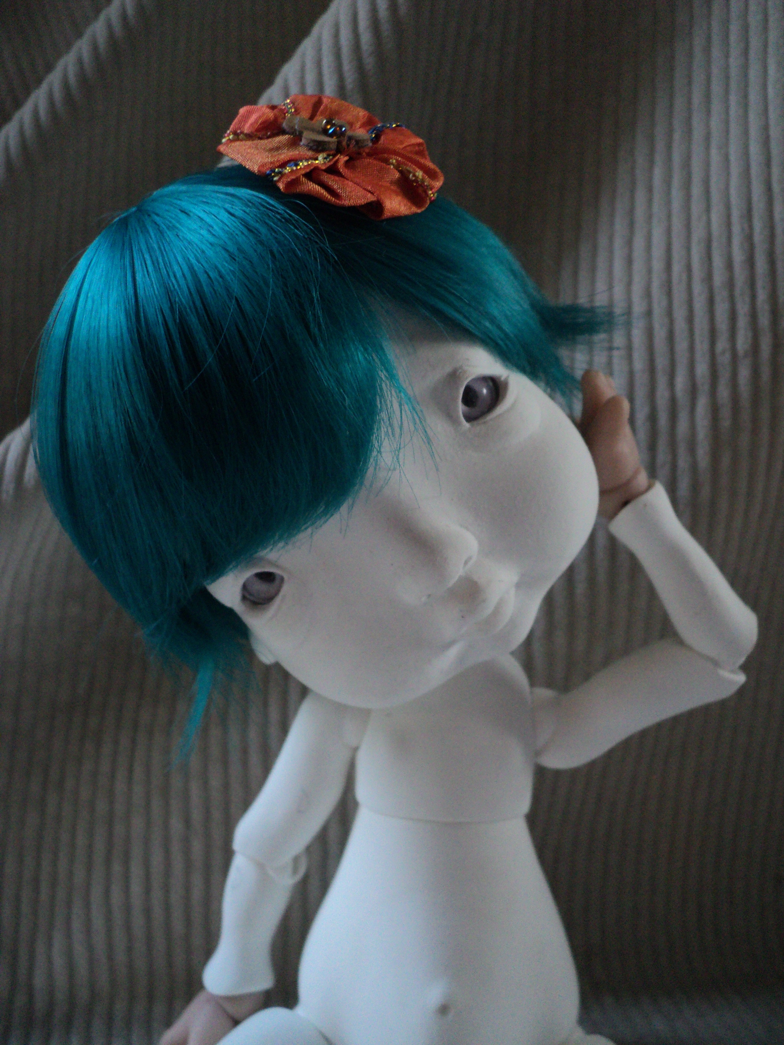 Now, the photos! With light pink eyes, a new green blueish wig and a hand knitted little hat made by my mother. I confirm that her eyes size is 12mm, and her wig size is 7/8.