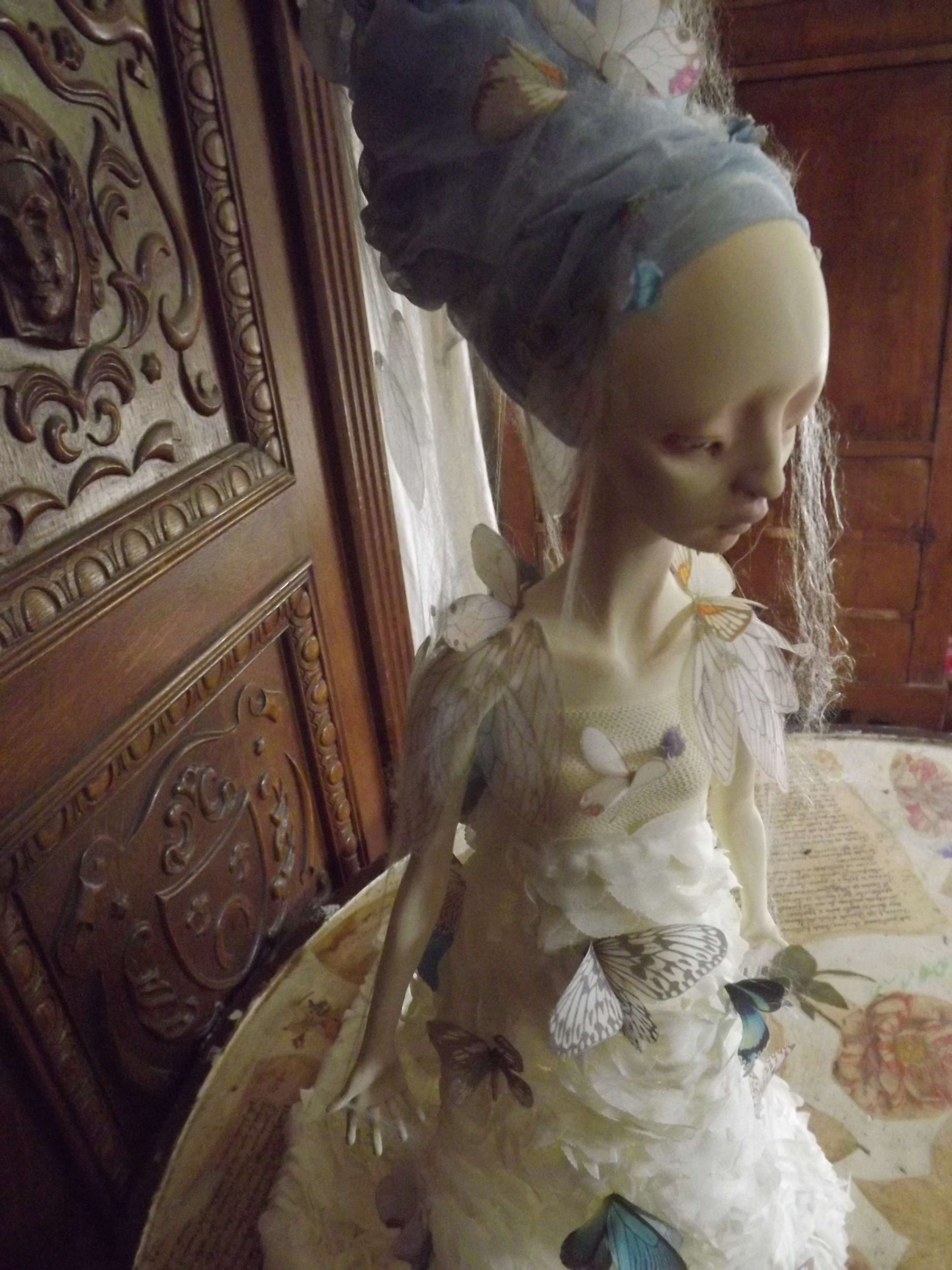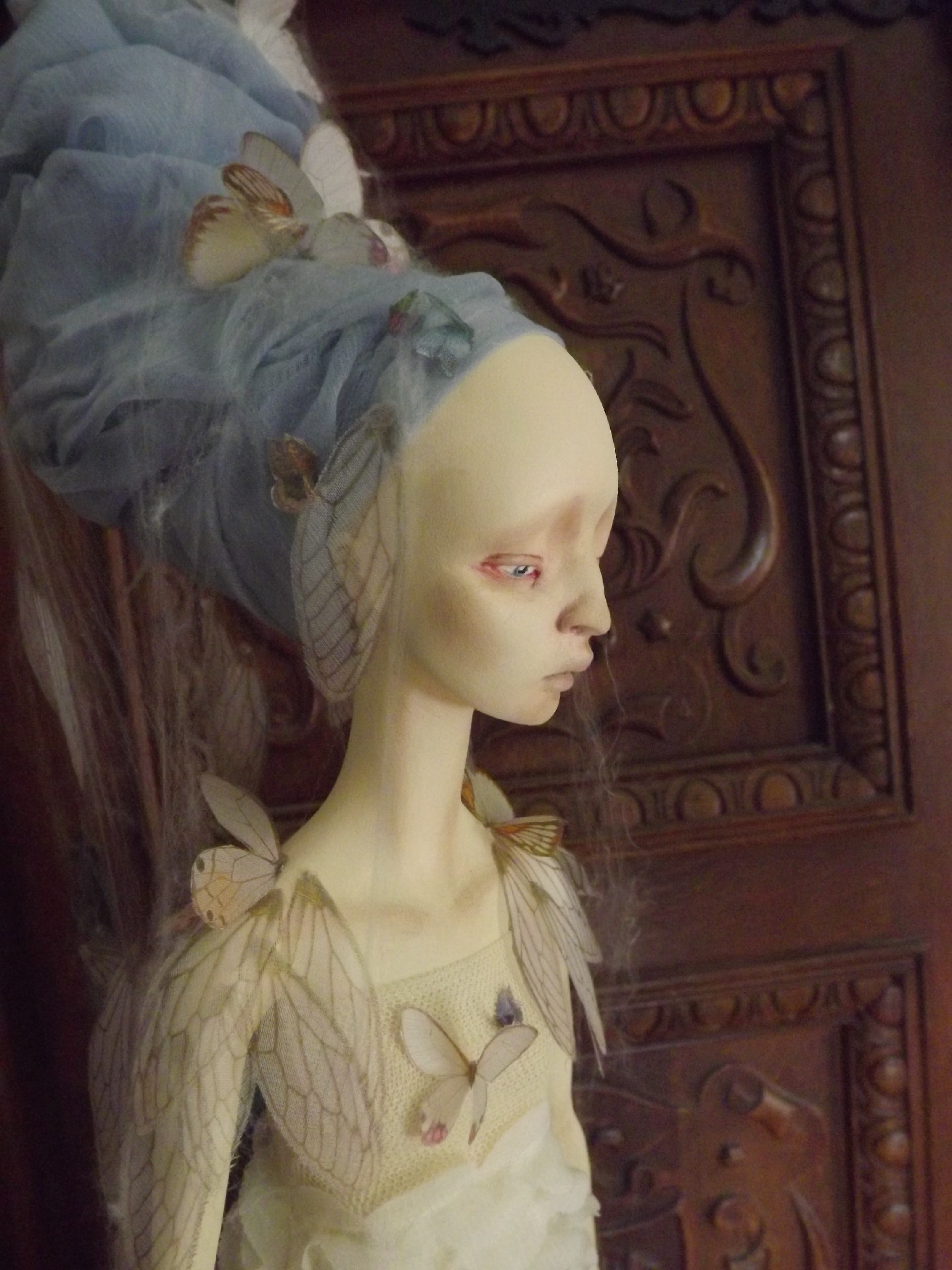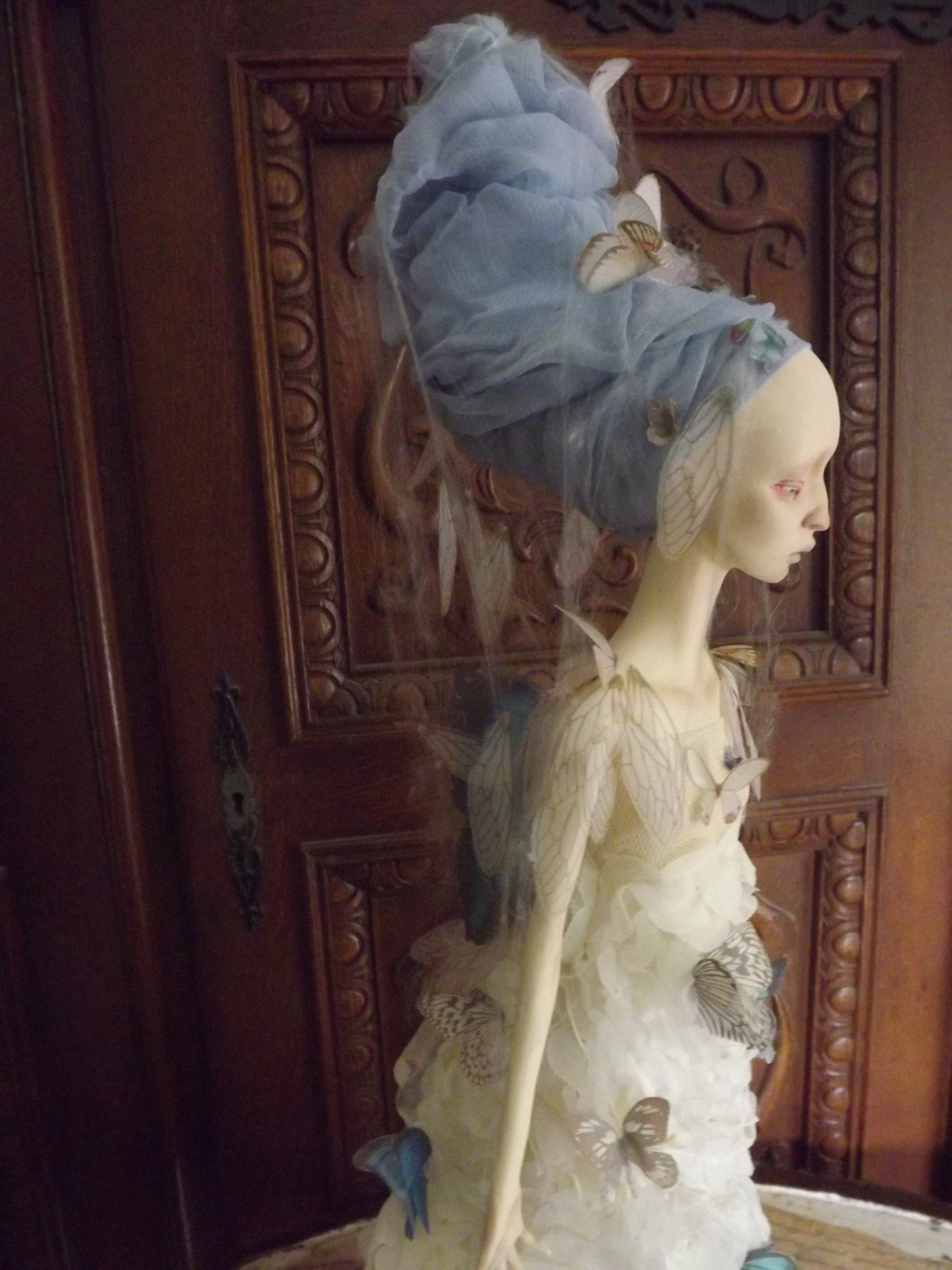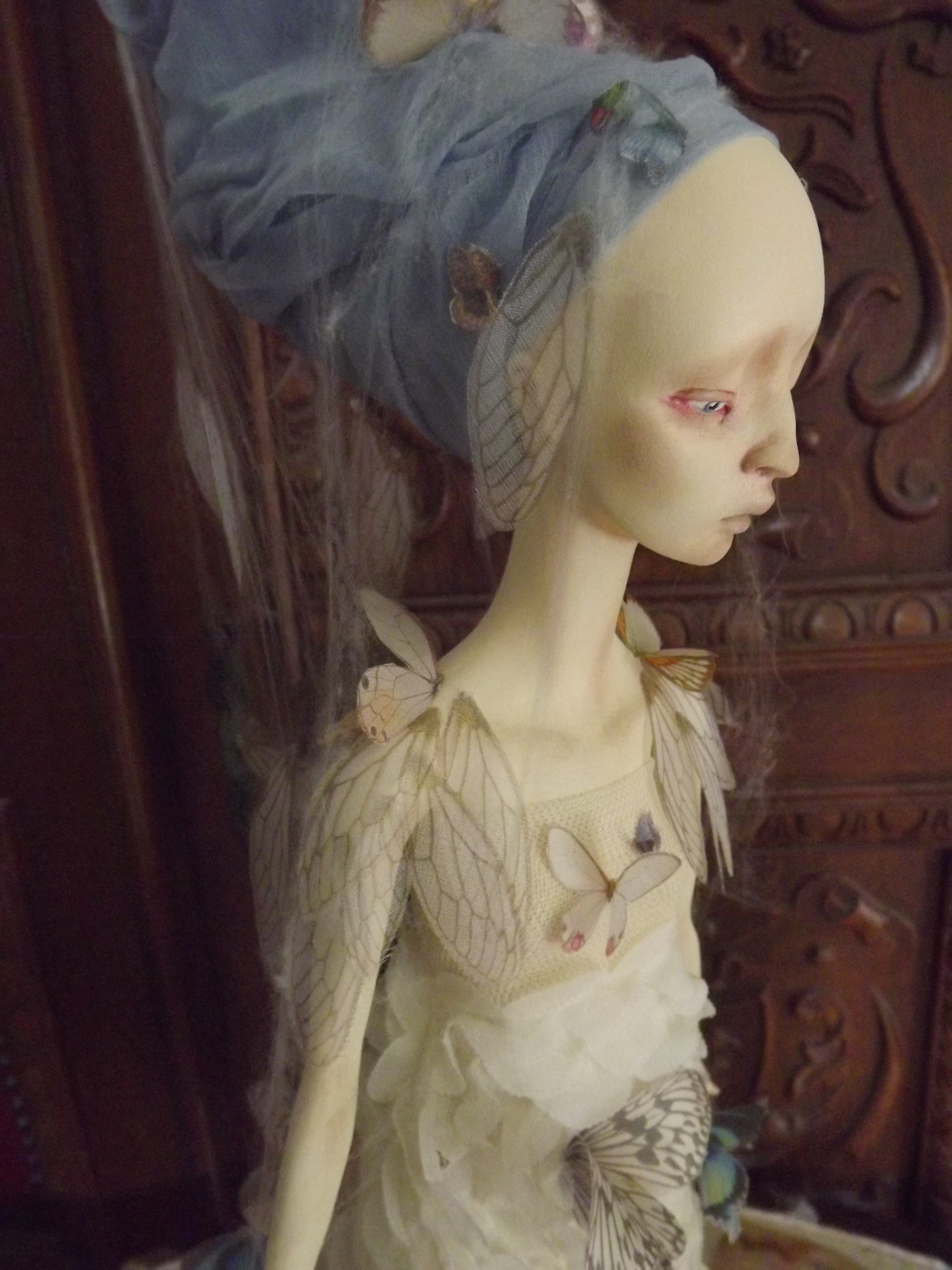 Her face has been painted with oil paints following the very same process used by Vermeer using is renown glaze technique (yep I got great books ^^) Therefore the shadows on her face come from the first layer of paint which is ash-gray… Yes, I had a panic time when I saw her face totally gray wondering how it would end up, but the master was of course right : that glaze technique WORKS. She is, of course, free standing, in a Degas ballerina pose and anatomically correct. Funny part : her arms as hands and fingers have NO armature. They are only built from paperclay ^^ The butterflies and cicada’s wings are in silk and organza made by me using a technique of mine. Working with spider webs… has been a NIGHTMARE! lol