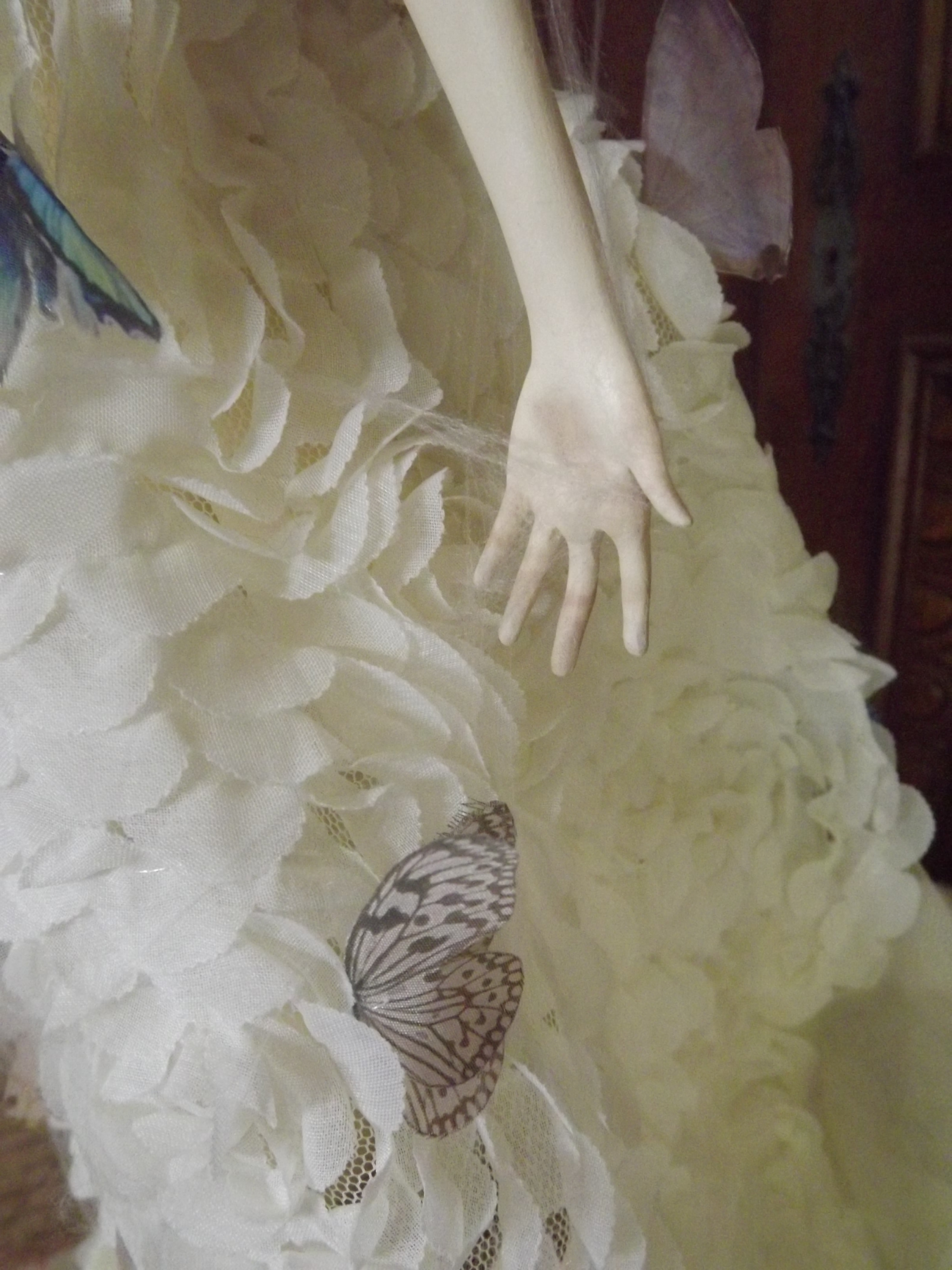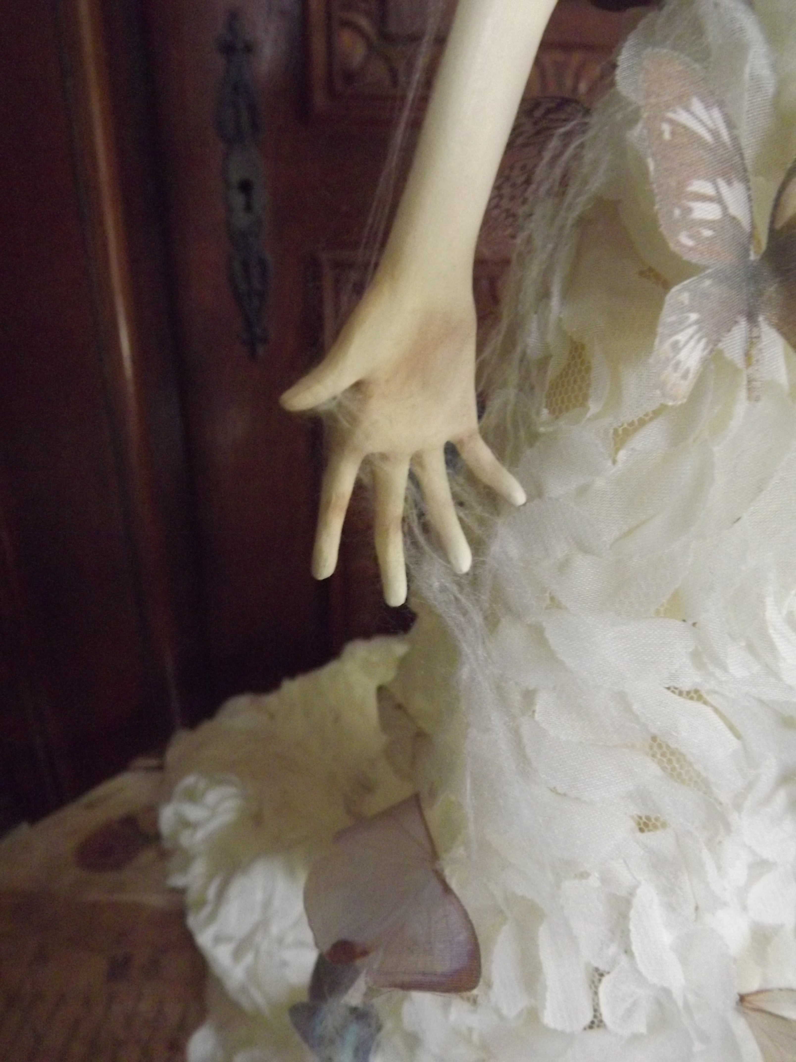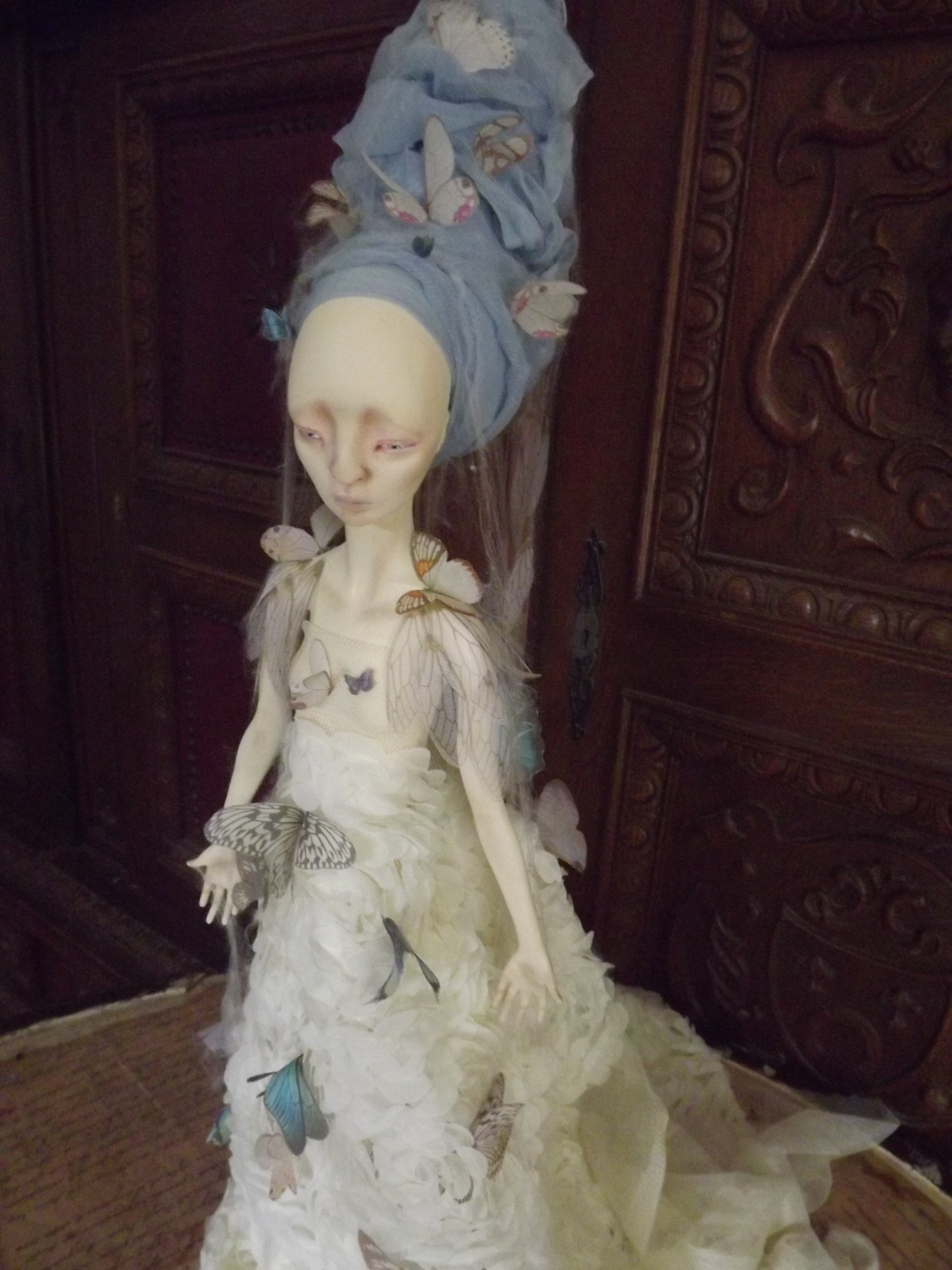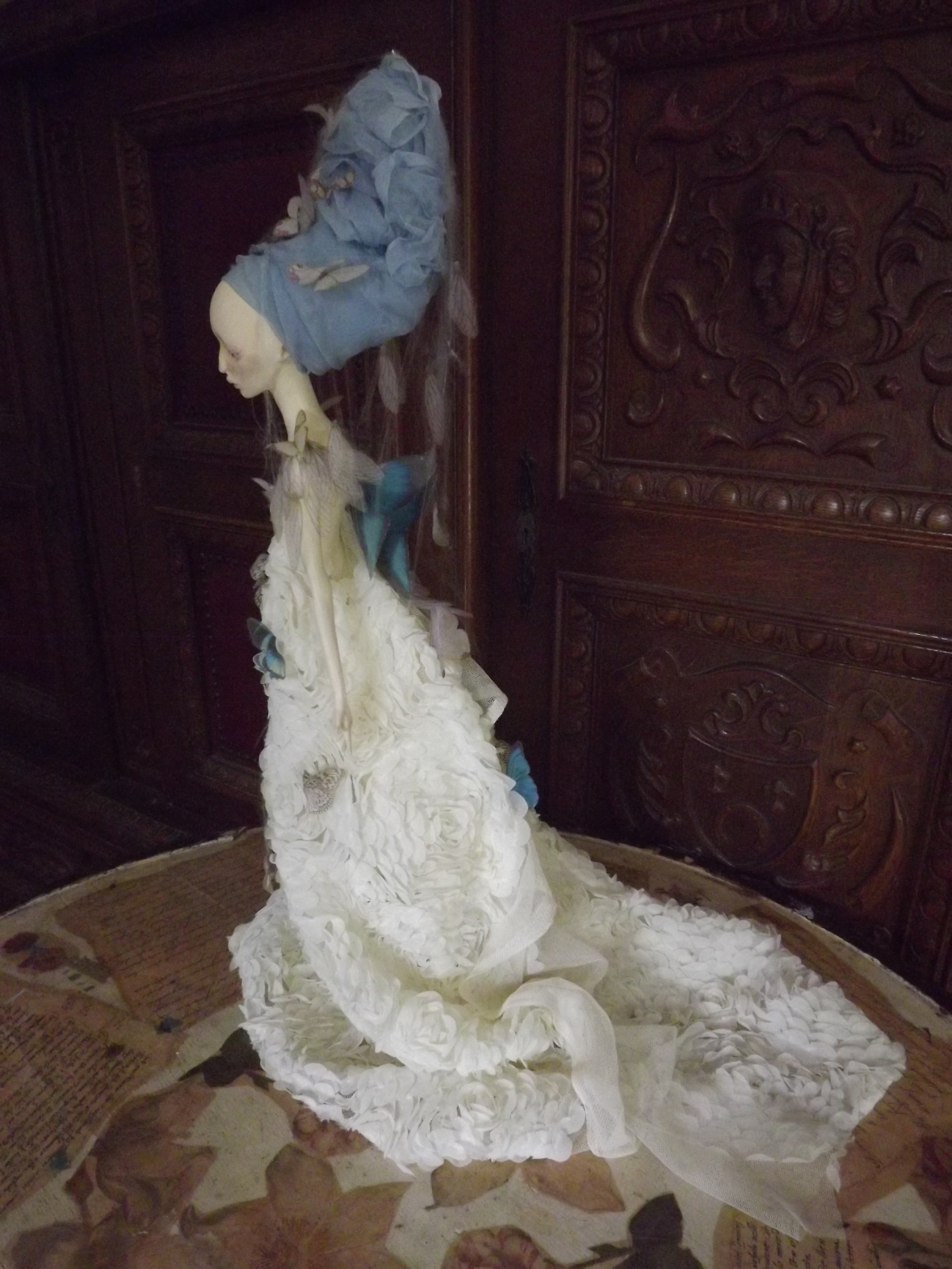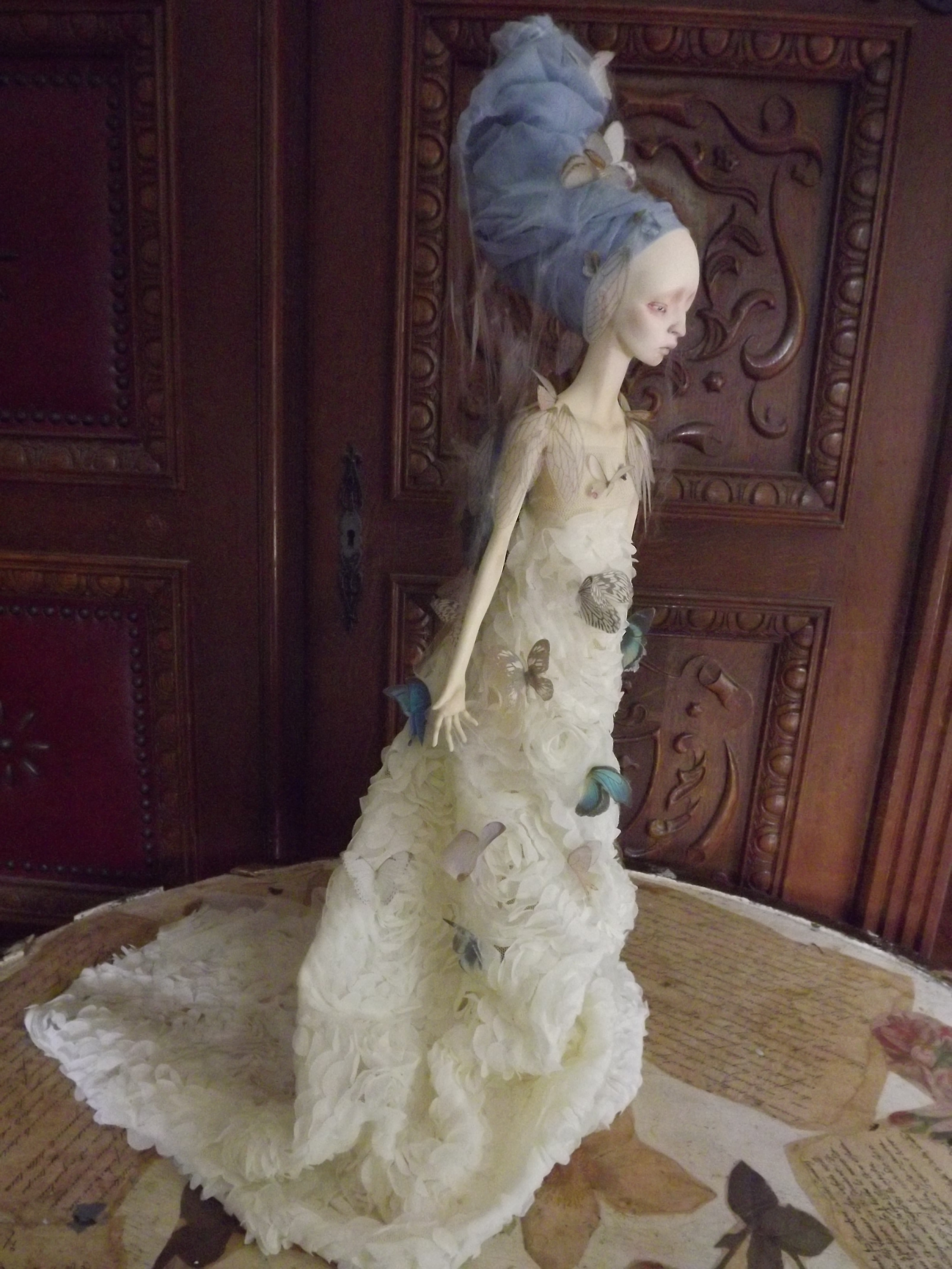 Her face has been painted with oil paints following the very same process used by Vermeer using is renown glaze technique (yep I got great books ^^) Therefore the shadows on her face come from the first layer of paint which is ash-gray… Yes, I had a panic time when I saw her face totally gray wondering how it would end up, but the master was of course right : that glaze technique WORKS. She is, of course, free standing, in a Degas ballerina pose and anatomically correct. Funny part : her arms as hands and fingers have NO armature. They are only built from paperclay ^^ The butterflies and cicada’s wings are in silk and organza made by me using a technique of mine. Working with spider webs… has been a NIGHTMARE! lol
