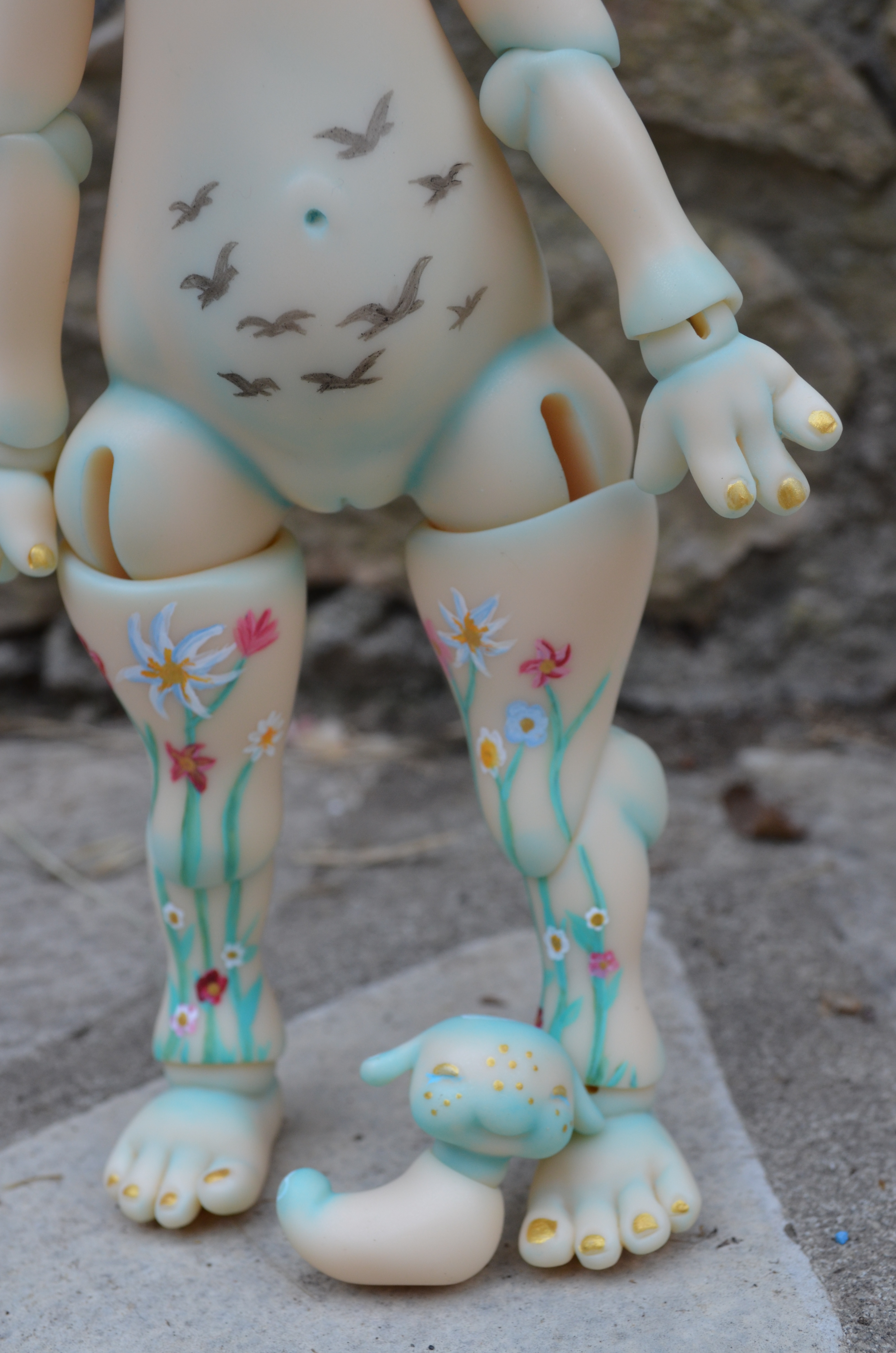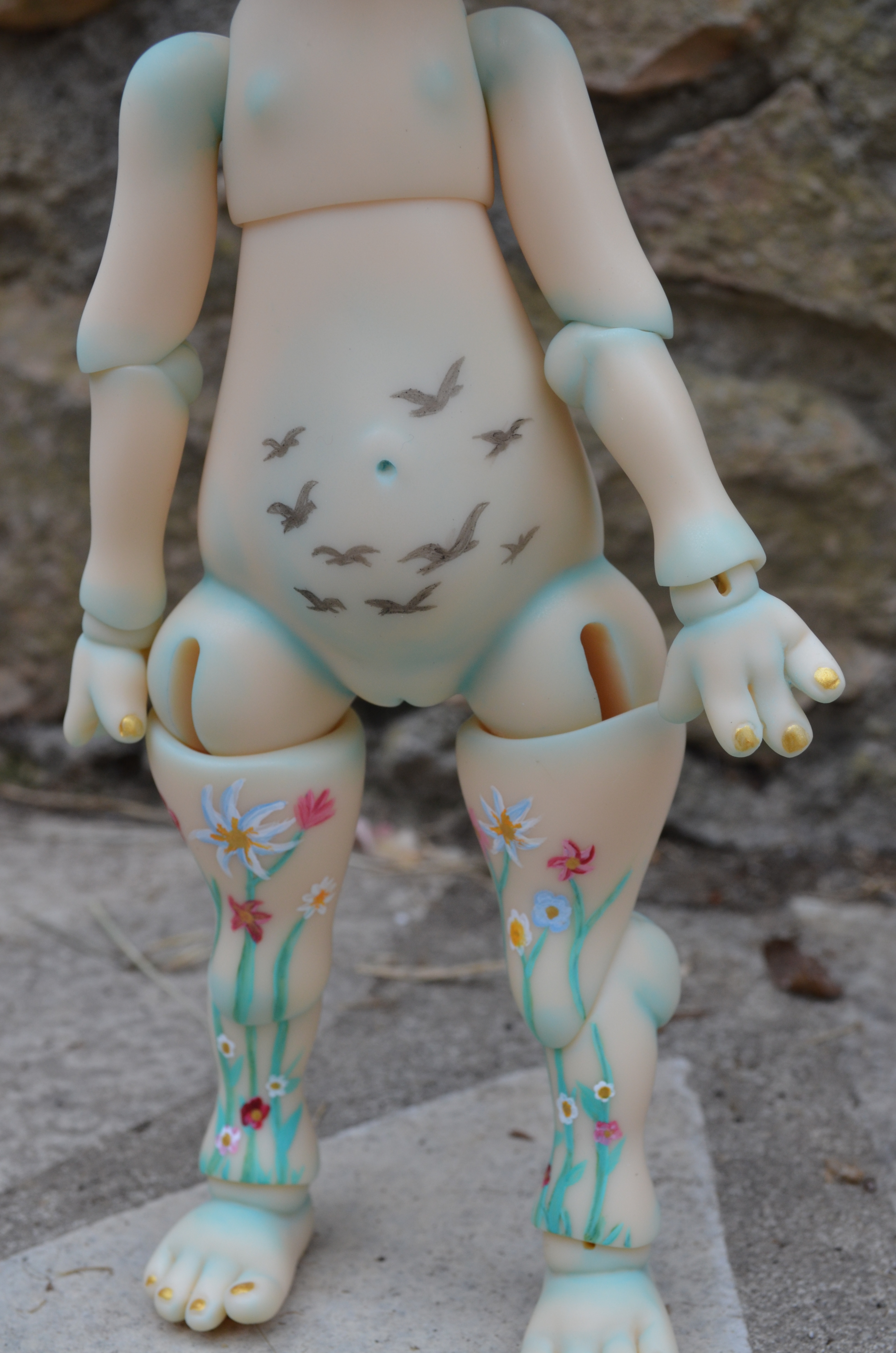 50$ for a doll. That includes a face up, a full body blushing, a pedicure manicure, a tattoo if required, and the complete painting of the little free resin friend. (and only 35$ for tiny girls as Suzy and her friend)