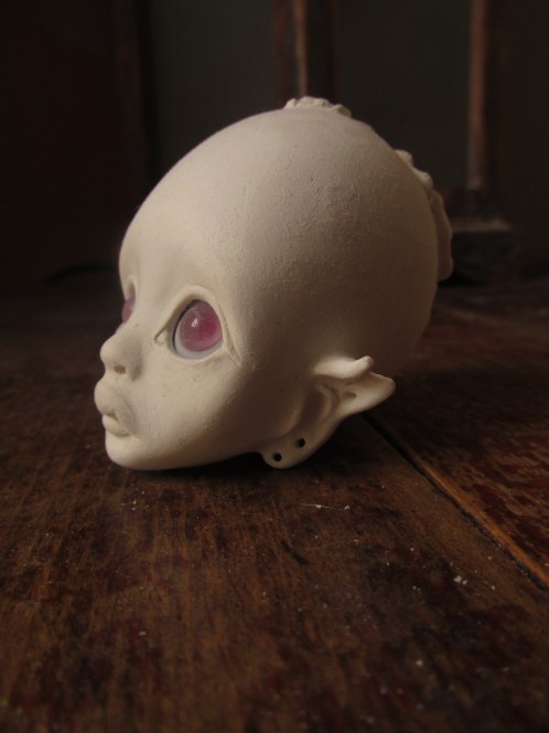 She is strangely wonderful. Her eyes are huge and her mouth is shut,it seems there is so much going on inside her mind. A whole unique universe behind her eyes. You only have to stop and look inside. I love her. She almost seems like a sea creature that has taken human form. She would be lovely in a pearly white color. So delicate. How amazing!